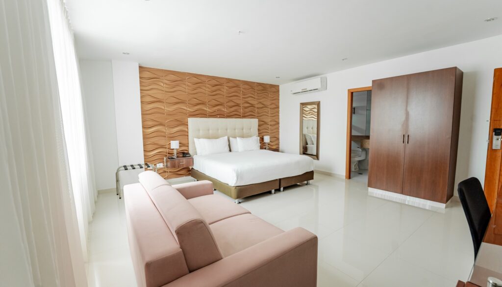Con 34 metros cuadrados, las habitaciones Estándar King del hotel parque del sol Montería, incorporan una estética moderna que invita al descanso y al bienestar. Cada detalle del ambiente ha sido pensado para que su estadía sea placentera, ofreciendo privacidad, tranquilidad y una sensación acogedora desde el primer momento.